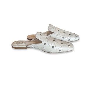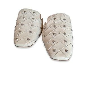 Elegant white mules with studded detail. Slip-on style. Perfect for casual or dressy occasions.
