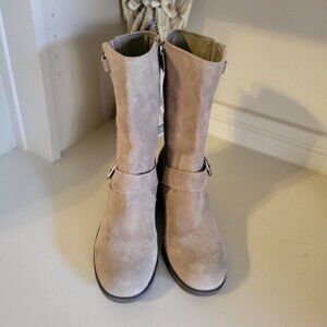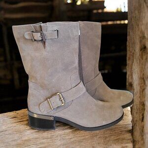 Stylish mid-calf boots featuring taupe suede upper, adjustable buckle straps, and convenient side zipper. Ideal for casual or smart-casual wear.