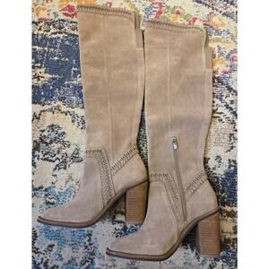 In excellent clean condition. The Vince Camuto Women's Over the Knee Boots in Madolee, size US 9 M, are a stylish and versatile addition to any woman's shoe collection. Made of beige suede with a round toe shape and low block heel, these boots feature a zip closure for easy wear. The over the knee style is both trendy and practical, with a solid pattern that can be worn for a variety of occasions. Comfortable and cushioned, these boots also have a stretch feature for added flexibility. Perfect for city or equestrian-inspired looks, these boots are a must-have for any fashion-forward woman.