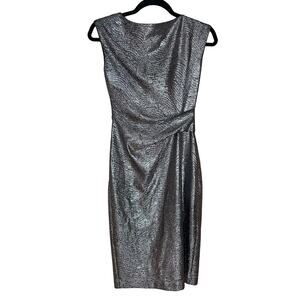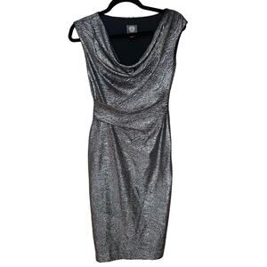 vince camuto dress, vince camuto cocktail dress, silver metallic dress, ruched cowl neck dress, womens party dress, vince camuto womens 0, metallic cocktail dress, silver evening dress, vince camuto formal dress, small size cocktail dress, cowl neckline dress, holiday party outfit, silver shimmer dress, elegant cocktail attire