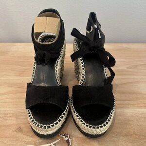 New in box Women's 7M True Suede / Ultra Soft This espadrille wedge will keep the eye busy with all its artisan flair. Jute & raffia woven wrapped wedges, whipstitch galore, and woven ribbon ankle wraps are the details that will draw you to this sandal. The padded footbed, lined strapping, and EVA comfort bottom will keep your feet coming back for more.