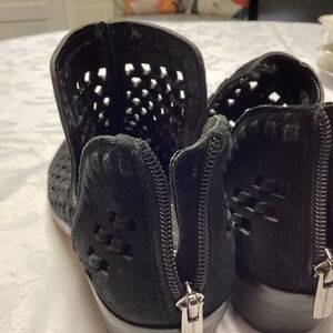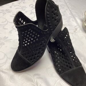 Questions? Leave a comment below! absolutely beautiful very, very gently worn. Black suede. with the nice perforation lovely block heelback zipper Great for winter fashion. Looks awesome with jeans !!!!add a njce blazer. And you have that favored fall look we all need. !!!