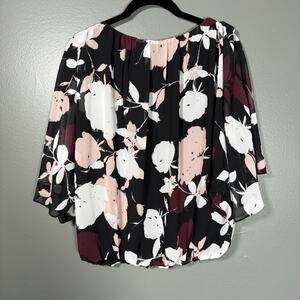 Women's romantic boho top by Vince Camuto. This black top has a pink and white floral pattern, elastic waist, wide 3/4 length dolman sleeves, and a round neck. It is 100% polyester with a polyester lining.