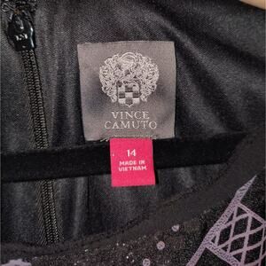 Vince Camuto Women's Black Purple Geometric Print Metallic Glitter Shift Dress 14. EUC. No tears, holes or stains. Crew Neckline. Back Zipper & Hook Eye Closure. Eyelash Detail Black Trim Around Neck, Sleeves & Hem of Dress. Raw Hem Edges. Glitter on the dress is also a little loose so you might see some light transfer, but nothing super crazy. Shell: 95% Polyester 5% Spandex/Combo & Lining: 100% Polyester