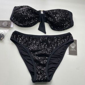 Vince Camuto Womens Black Sequin Lux Bandeau Bra Bikini Top & Bottom Set Small