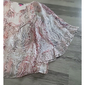 The product is a women's blouse by Vince Camuto in a paisley pattern. This top is designed specifically for women and is brand new with tags. The classic paisley design adds a touch of elegance and style to any outfit, making it a versatile and fashionable addition to any wardrobe. Made by a reputable brand like Vince Camuto, this blouse is sure to be of high quality and well-crafted for a comfortable and flattering fit.