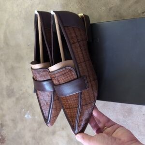 Loafers, loafers, loafers. The Calentha penny loafer has a pointed toe and a squared off block heel with metal rand detailing. Available in leathers and a collegiate tartan haircalf, this loafer is the finishing touch for your everyday ensemble.