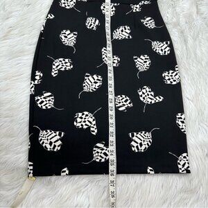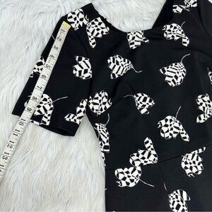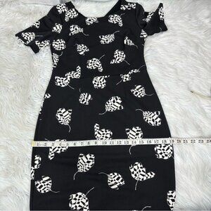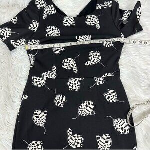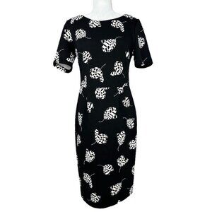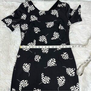Vince Camuto women's black size small dress, it has a crew neckline, short sleeves, contemporary floral design, back v-neck accent, back zip closure, and thick stretchy fabric. Materials 93% polyester, 7% spandex. Care machine wash cold line dry. Condition is preloved very good as shown in pictures. Please preview the measurements to ensure fit.