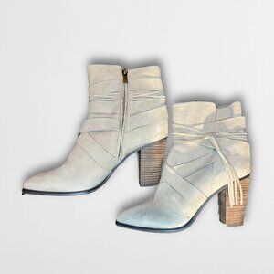 Elevate your footwear collection with these Vince Camuto Ferrah Booties. Crafted from soft suede in a versatile tan shade, they feature chic wrap-around detailing and a comfortable stacked heel. Ideal for adding sophistication to your look while ensuring all-day comfort.
