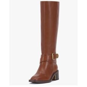 The product is a pair of Vince Camuto Women’s Gini Brown Knee High Boots in size 7.5M with a wide calf width. These riding-style boots feature a solid brown color, round toe shape, low block heel, and are made of leather. Perfect for women looking for a stylish and comfortable option for their wardrobe, these boots offer a blend of fashion and practicality.