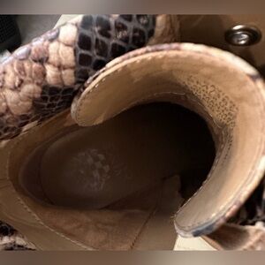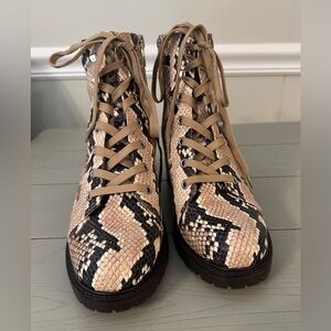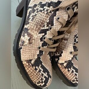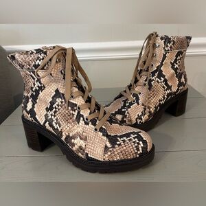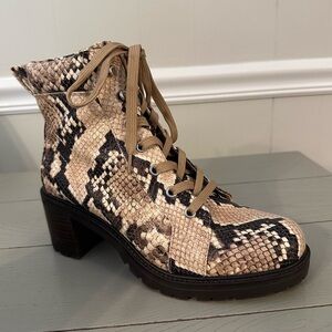 Elevate your look with these stylish snakeskin lace-up boots. Featuring a striking pattern in tan and brown, these boots offer both fashion and comfort. Perfect for any occasion.