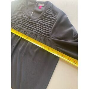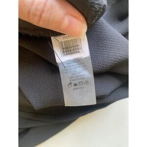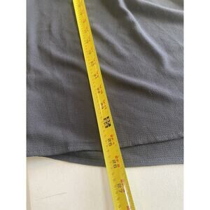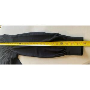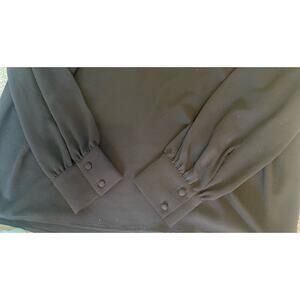 Vince Camuto black, light weight women's top. Size Medium. Approximate measurements are 25" long in the front, 26" long in the back, 27.5" sleeve length and 20.5" pit to pit laid flat. Loose sleeves that tighten at the bottom with button details. Top of the blouse has a ruffle design. Good used condition. No flaws to notate.