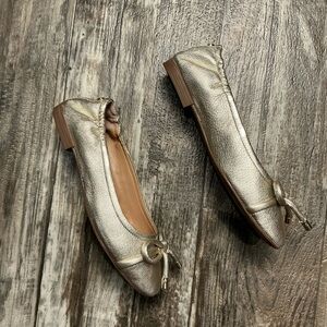 Chic metallic flats with bow detail. Perfect for versatile styling.