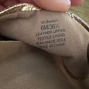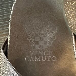 Chic metallic slide sandals by Vince Camuto. Features a stylish knot design. Ideal for casual outings.