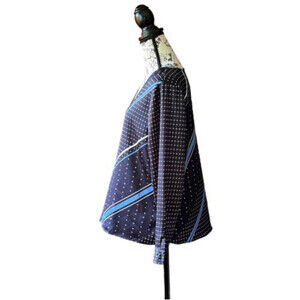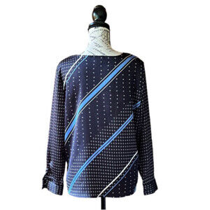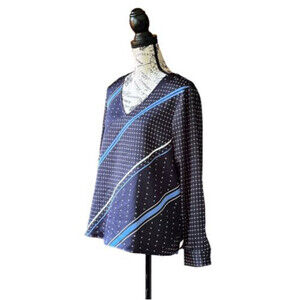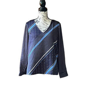 Add a touch of modern elegance to your wardrobe with this Vince Camuto navy blouse. Designed with a flattering V-neckline, this long sleeve top features a chic combination of small white polka dots and bold diagonal stripes in shades of blue, giving it a fresh and stylish twist. The lightweight, flowy fabric makes it perfect for layering or wearing on its own.