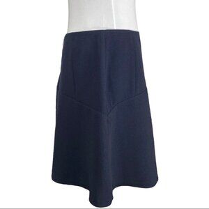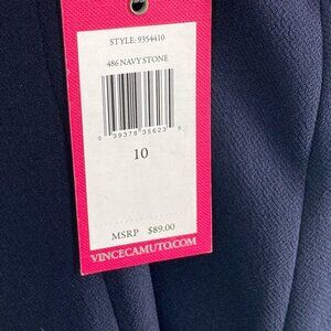 Vince Camuto women's size 10 skirt, A-line style, color is navy blue, lined, above the knee length, wide waistband, sexy exposed back zip closure and flowy fabric. Materials shell/lining 100% polyester. Care dry clean. RN51323. MFSR$89.00. Condition is new with tags as shown in pictures. Please preview the measurements to ensure fit.