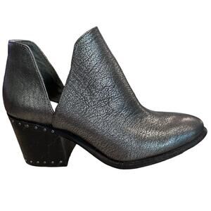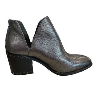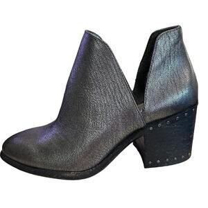 Keywords: Vince Camuto, bootie, pewter metallic leather, women's boot, block heel, mid heel, cutout design, studded details, closed toe, pre-owned, size 6M, EU 36.