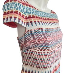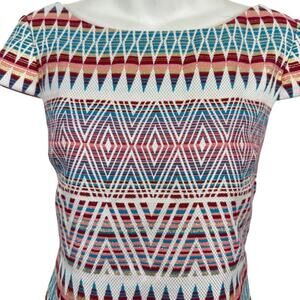 Elevate your wardrobe with the Vince Camuto Women's Print Cap Sleeve Sheath Mini Dress. A striking geometric pattern in a medley of colors makes this dress a standout piece for any occasion. The short, cap sleeves and round neckline provide a sleek silhouette perfect for a day at the office or a night out. Crafted with a blend of rayon and polyester, this dress promises comfort and style. It's fully lined for an impeccable fit and finished with a convenient zipper closure. Versatile enough for business meetings, casual outings, or cocktail parties, this dress is a year-round companion, ideal for spring, summer, and fall. Dry clean only to maintain its vibrant look.