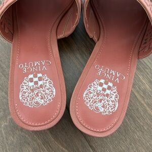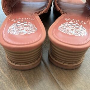 Vince Camuto Women's Rallema Low Wedge Slide Sandal Sushi Nubuck Size 7 in very nice used condition. These Rallema wedge slides are so cute and comfortable in a pretty pink salmon color. They have cosmopolitan cutouts and whipstitching and an approx. 1-3/8"H wedge heel. Fit true to size, leather upper, man made lining/sole. Super cute 🩷