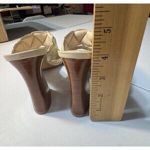 Vince Camuto, two strap leather slide heels with padded straps, cream leather with faux wood heels