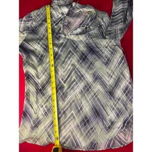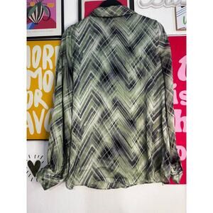 Add a touch of bold elegance to your wardrobe with this Vince Camuto women’s blouse in size XS. This sheer, lightweight top features a striking green geometric chevron pattern with black and white accents. Designed with a relaxed fit, it includes a collar with front tie detail and buttoned cuffs engraved with the Vince Camuto logo. Ideal for both casual and professional settings.