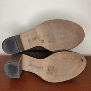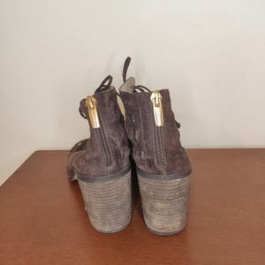 Super cute women's booties in brown suede featuring a fun laser cut design, peep toe, laces, and block heel in excellent condition