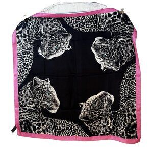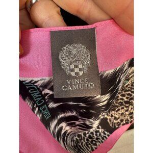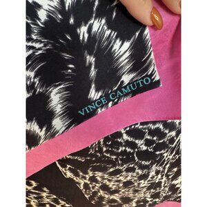 Vince Camuto Women’s Silk Scarf Leopard Black White Pink Head Wrap Neck Glam 35”. This is a chic silk scarf by Vince Camuto featuring a bold leopard or animal print pattern. The colors mentioned—black, white, and pink—suggest a modern take on the classic animal print, adding a pop of color (pink) for a glamorous touch. Its size is approximately 35 inches, making it a versatile accessory that can be styled as a neck scarf, head wrap, or even tied onto a handbag. Length 35" and width 35". Made in China. Excellent Condition.