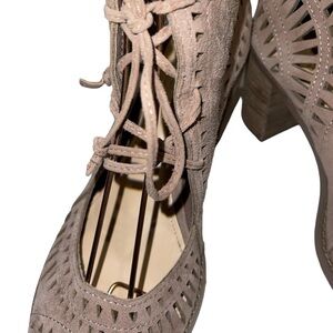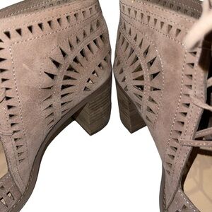 Vince Camuto Women's Size 7.5 Lace Up Open Toe Booties Tan Suede Back Zip Close