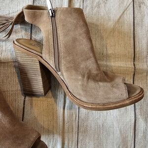 Vince Camuto Women's Size 8 Kyleena Open Toe Block Heel Fringe Festival Shoe. In Pre-owned condition with normal signs of wear but tons of life left. 4 inch heel.