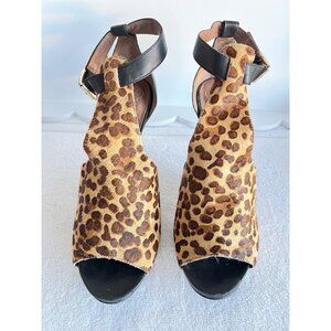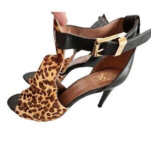 This is a pair of Vince Camuto Women's Size 11M Gartina Heels Pumps with an open toe design and made from real cow hair leopard print.
