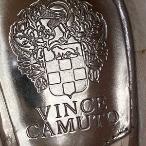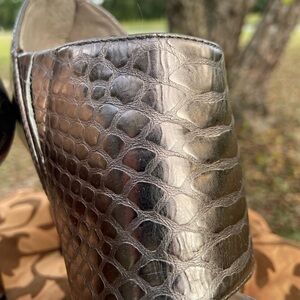 Vince Camuto Women’s Snake-Embossed, Pewter- Colored, Leather Heels, Size 6.5. EUC. These have never walked on concrete. Sole bottoms are in new condition. Beautiful, metallic neutral color and snazzy, sexy style. 4-inch heel. Zip backs. From a smoke-free home. Thanks for looking.