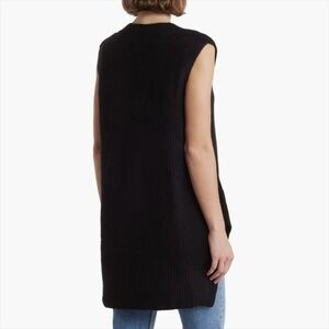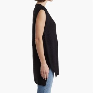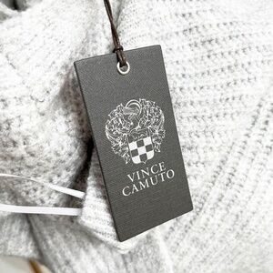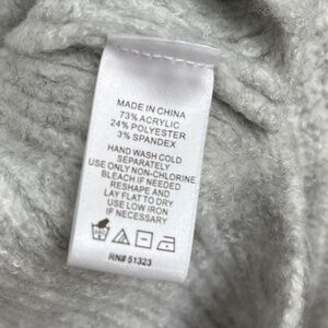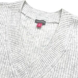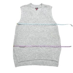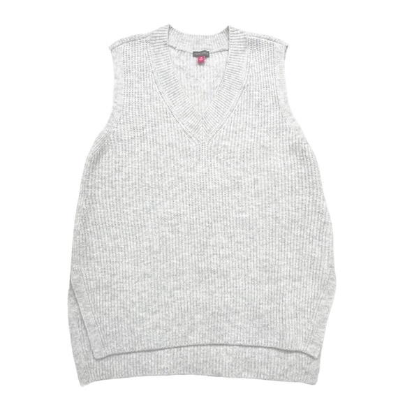 Vince Camuto Women's Shaker Stitch Sweater Vest. COLOR: Light heather gray. Runs large with a slightly oversized fit. Pullover. V-neck. High-low hem. More of a tunic length. Soft, slightly fuzzy. 73% acrylic, 24% polyester, 3% spandex. Hand wash cold. Lay flat to dry.