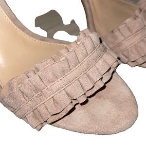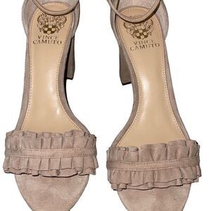 Vince Camuto Womens VV Clarista 3.5" Block High Heels Sandals Ruffle Strap Leather Upper Formal Party Nude Tan Size 8.5 M / 39