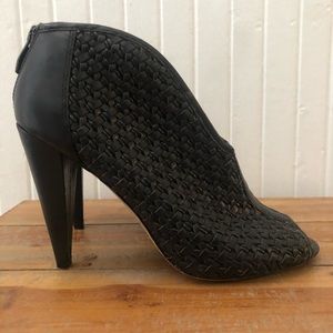 Super cute. Leather. Peep toe. Zipper backs. Preloved but in great condition. Inner label on sole is scratched from sticky cushion as pictured. Other than that, these are pretty awesome. Heel is 4 inches.