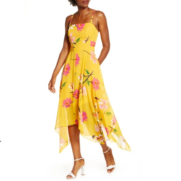 Vince Camuto Yellow Chiffon Fit and Flare Floral Dress