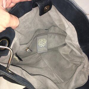 Vince Camuto black pebbled leather handbag with asymetric edge also has a shoulder strap, gray inside.