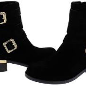 Vince Camuto Black suede ankle booties with gold buckles. New in box.