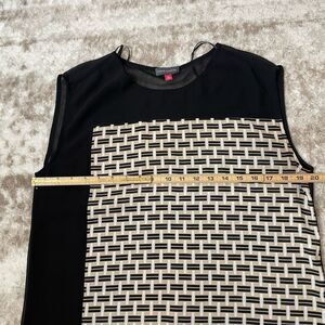 Women’s sleeveless blouse, geometric print top, black and white patterned shirt, scoop neck blouse, lightweight casual tank top, modern workwear blouse, woven print sleeveless top, chic office blouse, versatile monochrome shirt, summer layering top