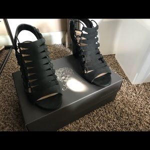 Black open toed Vince Camuto heels in size 9M. Only worn once and placed back in box. Comes with original box. Willing to trade for purse or submit anoffer. 😀