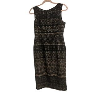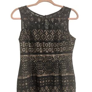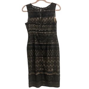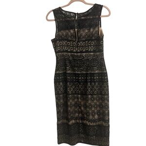 Vince Camuto black lace dress with tan underlay. Excellent preowned condition. Will ship within one business day.