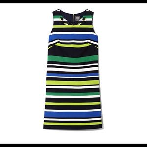 Vince Camuto embellished neckline stripe dress. NWT. Silky scuba fabric printed with sporty blue and green stripes gets fashionably primped with cabochon and faceted rhinestones trimming the round neckline. The splash of color spruces up classics such as a denim jacket and a black satchel.