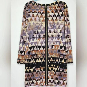 Vince Camuto geometric triangle multicolored long sleeve mini dress with gold zipper down along the back. Black jewel embellishments along the top neckline. Size 6. Excellent condition.