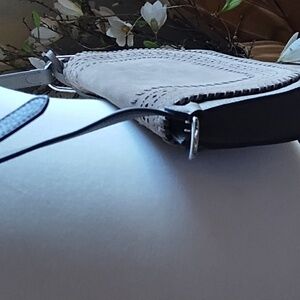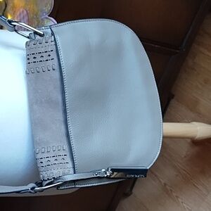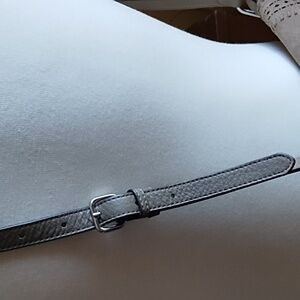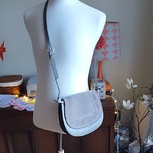 Exterior slip pocket. Snap flap closure. Adjustable Crossbody strap. Interior slip pocket. Small discoloration on flap as pointed out in picture. Comes with dust bag.