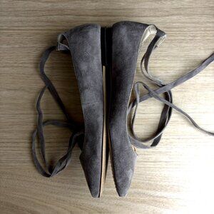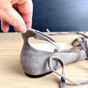 Vince Camuto greige suede lace-up ballet flats. Fun to wear year round. Slip-resistant rubber soles.