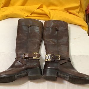 Vince Camuto knee boots brown leather brass accent buckle CHP riding low heel 8M