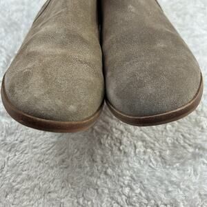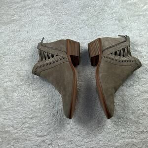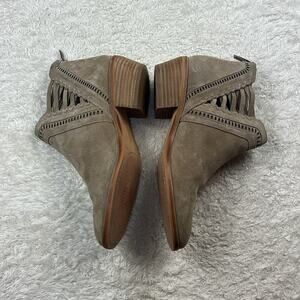 Vince Camuto laser cut ankle boots or booties. Size 9. Features taupe suede - genuine leather and back zip closure. Some wear to top back, see last pic.