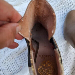 I wore these very briefly as you can see by the very scant wear. The inside was some weird material so as you can see by photos..I removed it so the leather was exposed.