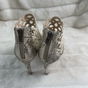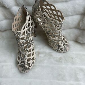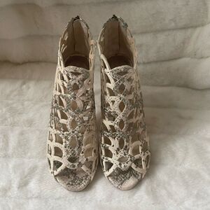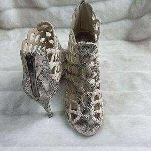 Vince Camuto leather beige & light gold reptile prints cage ankle heels peep toe back zipper SZ 8.5 pre owned in good used condition normal wear see all pictures any questions please message..