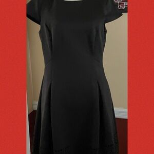 Fully lined, scoop neck, cap sleeves zipper back closure with lace detailing at hem. Measurements are approximately 18” armpit to armpit, 16” waist and 36” length from shoulder to hem. Perfect for holiday parties. Everyone needs a little black dress. In excellent condition. Dry clean. NECKLACE SOLD SEPARATELY.