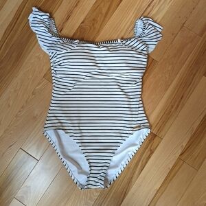 Super cute striped one piece swimsuit with ruffled straps. Like new.